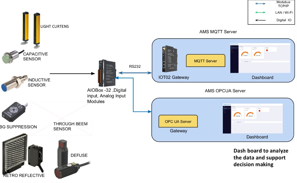 Digital Kit is an Ethernet-based integrated sensor and control system. ODOT Control is merged with DI signals from the Inductive Sensor, Thru-Beam Sensor, Retroreflective Sensor, Diffuse Sensor, Background Suppression Sensor, Capacitive Sensor, and Light Curtain Sensor. ODOT Gateway and the Modbus TCP Protocol are both used for data transmission via Ethernet.