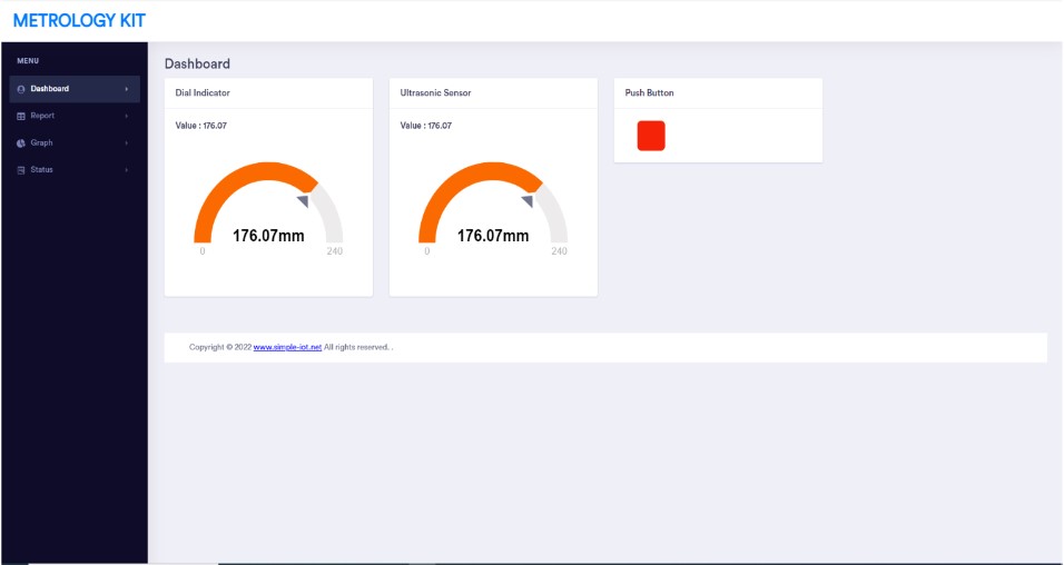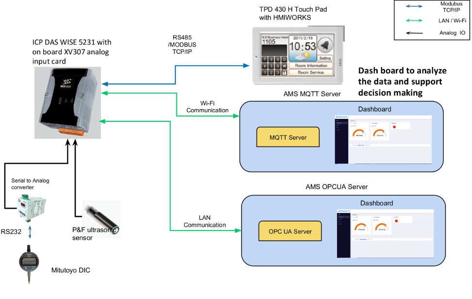 Metrology Kit is an Ethernet-based integrated sensor and control system. ICP Das Control is merged with DI and AI signals from the Pushbutton, Ultrasonic Sensor and Dial Indicator. ICP DAS Gateway and the Modbus TCP Protocol are both used for data transmission via Ethernet.