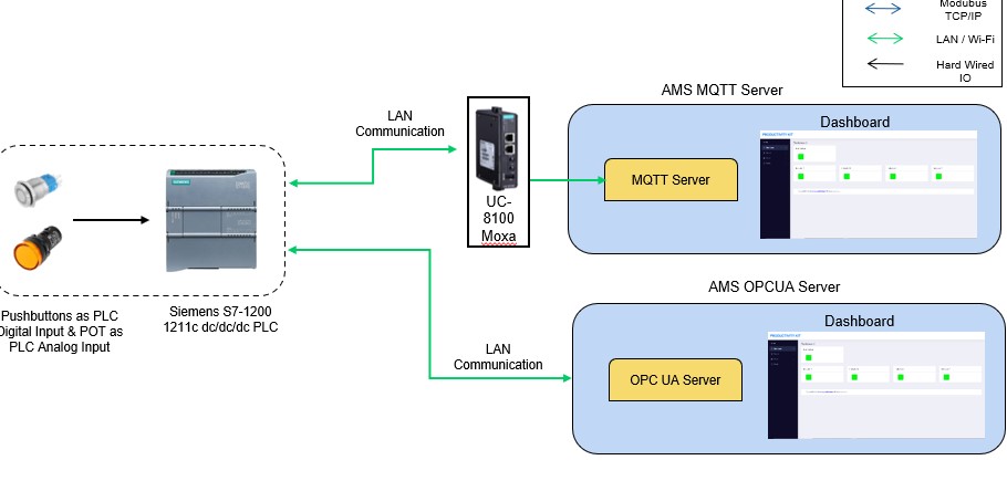 Productivity Kit is an Ethernet-based integrated sensor and control system. Simens PLC Controller is merged with DI and DO signals from the Pushbutton and Indicators. Moxa Gateway and the Modbus TCP Protocol are both used for data transmission via Ethernet.